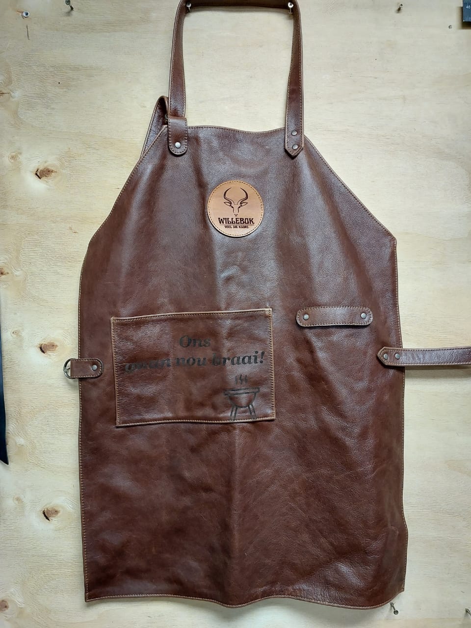 Handmade leather Braai Apron – Ideal for the braaier outside or the chef in the kitchen! We can engrave a name, date or even a famous line used in your home!