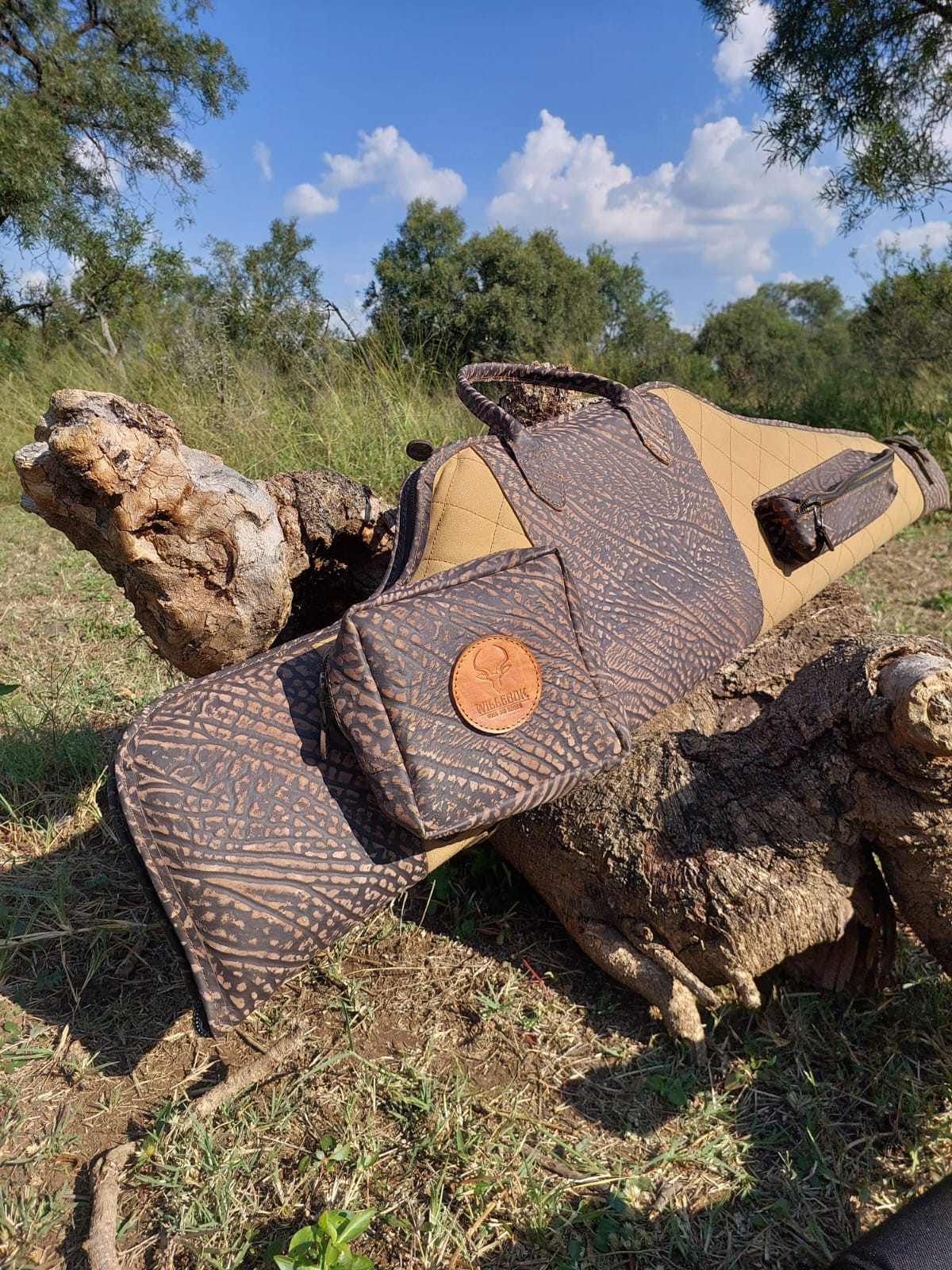 Protect your rifle in rugged style with this premium bag crafted from 100% Buffalo Print leather and canvas blend. Featuring a cozy wool lining, 25mm foam padding, and durable YKK zippers, it offers superior protection and comfort for every adventure. Two smartly placed pockets hold ammo, tools, or attachments, while a 1320mm length fits most rifles perfectly